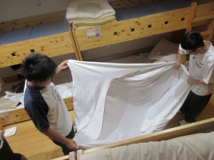 お風呂の後は、友達と協力し合って、寝る準備を行いました。